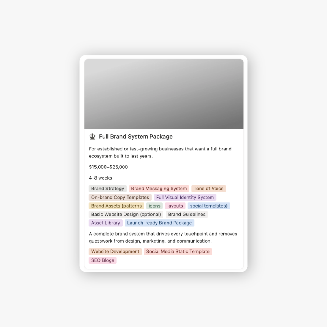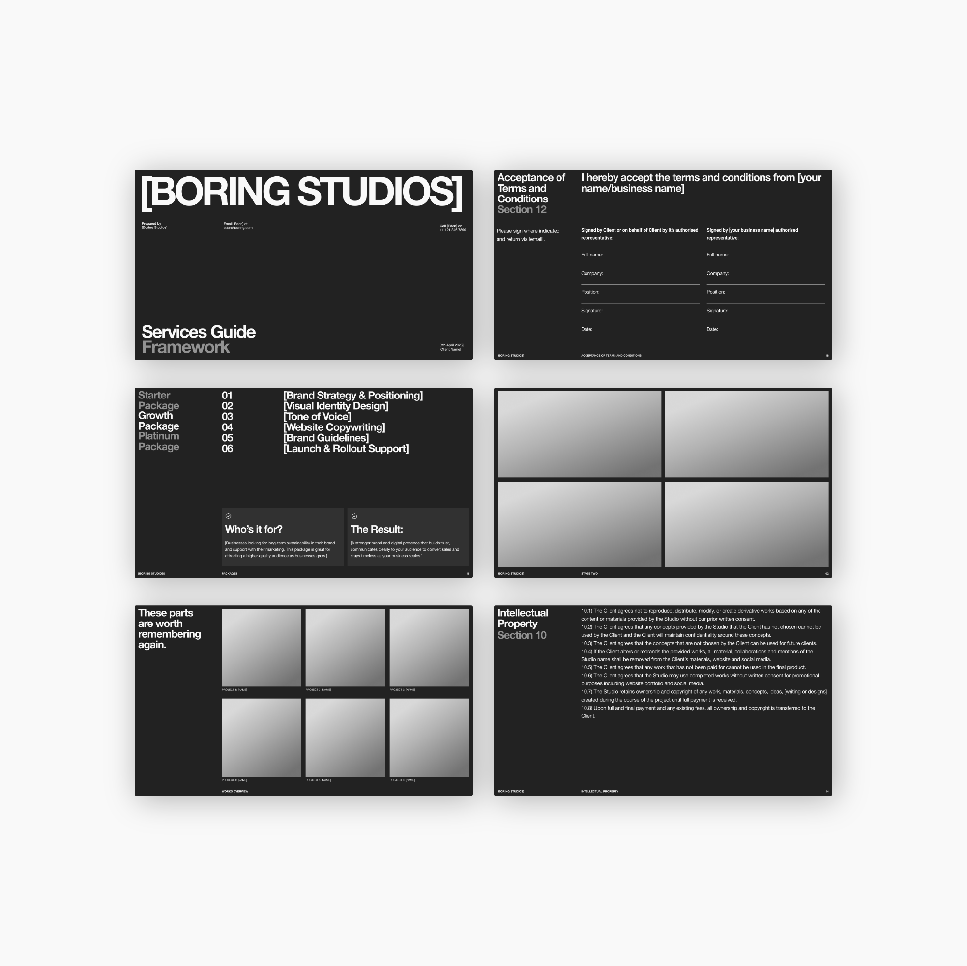 Includes: Portfolio, Services Guide, Proposal, Pitch, Contract, Invoice, Onboarding, Offboarding frameworks.