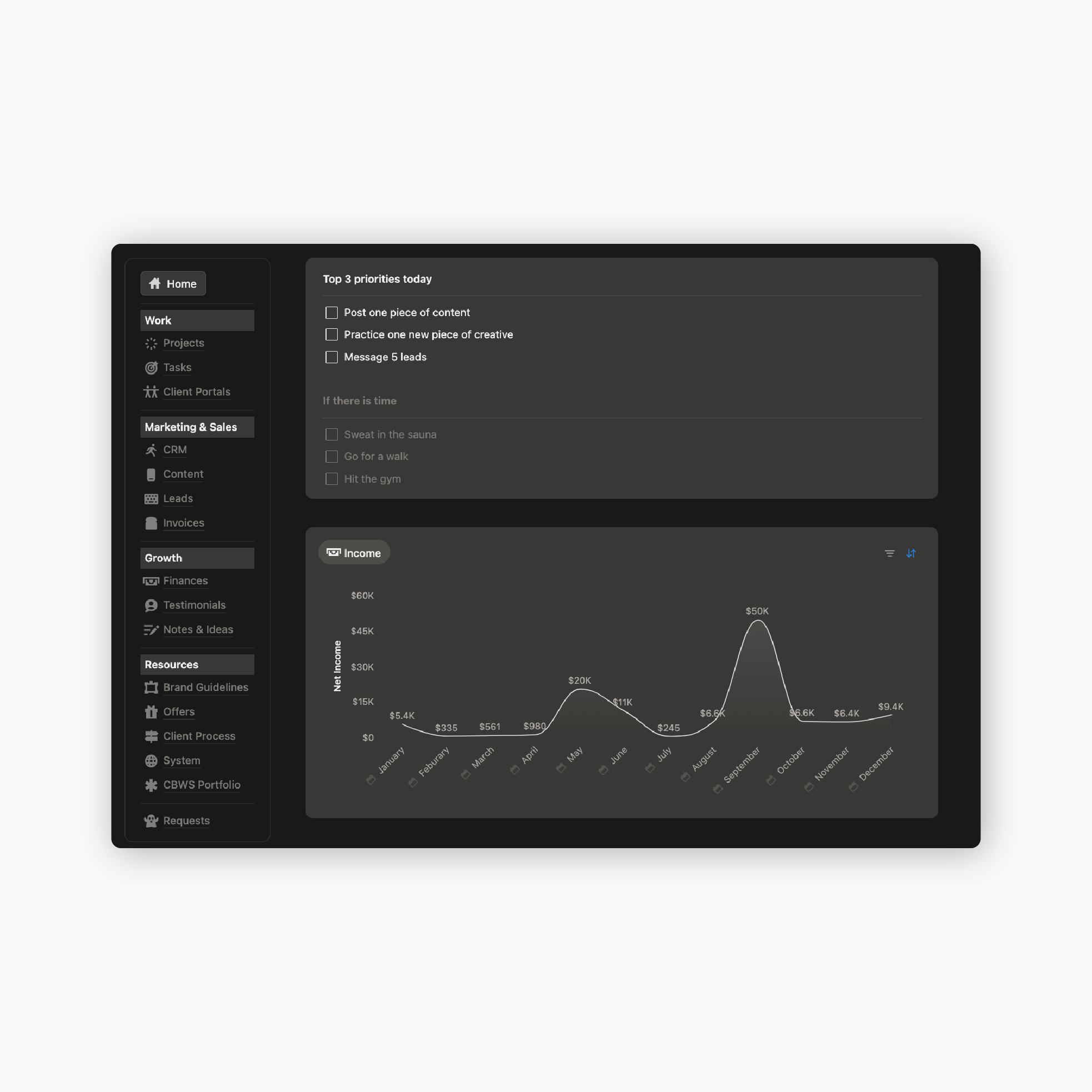 Includes a tracker for incoming revenue and outgoing losses, a CRM to manage your leads and an invoice tracker to stay on top of your client payments. With CBOS, your money becomes dependable, not a guesstimation or monthly scramble to pay rent.